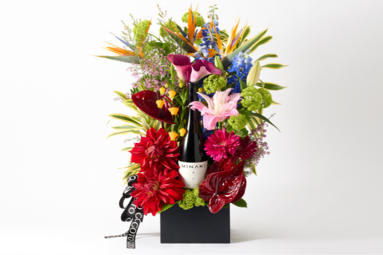 マットブラックのボックスに静かに添えられた日本酒「MINAKI」は、北の大地が育んだ澄んだ旨みの中に、凛とした余韻を持ちます。華やかな花と並ぶことで、贈りものに静かな重みが加わります。